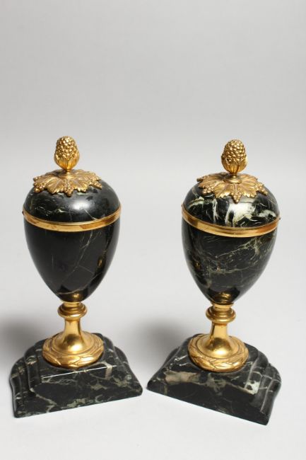 A GOOD PAIR OF 19TH CENTURY FRENCH MARBLE URNS, with pineapple finials. 8.5ins high.