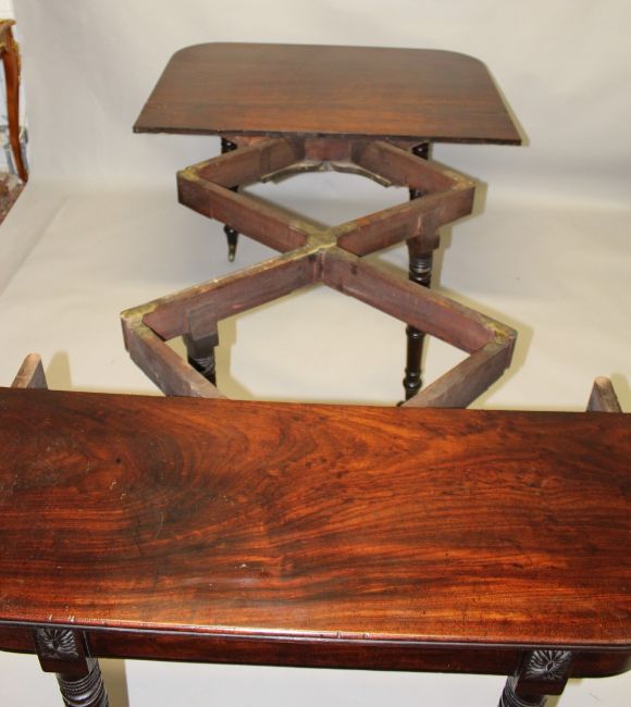 AN EARLY 19TH CENTURY MAHOGANY EXTENDING DINING TABLE, with patinated ratchet and hinged mechanism, the rounded rectangular top with two extra leaves, supported on six turned legs on brass castors.