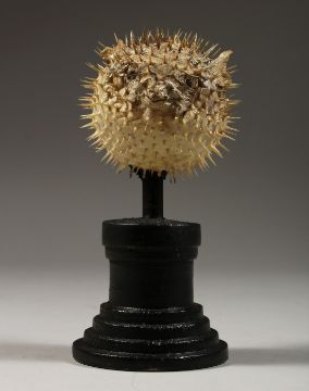 A SMALL PUFFER FISH SPECIMEN, 2.25ins on a wooden stand.