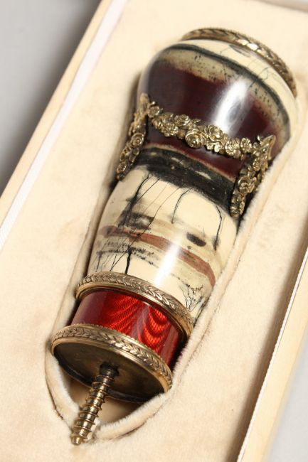 A SUPERB RUSSIAN SILVER GILT, ENAMEL AND DIAMOND SET HARDSTONE CANE HANDLE, with bouquets and garlands.