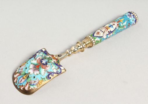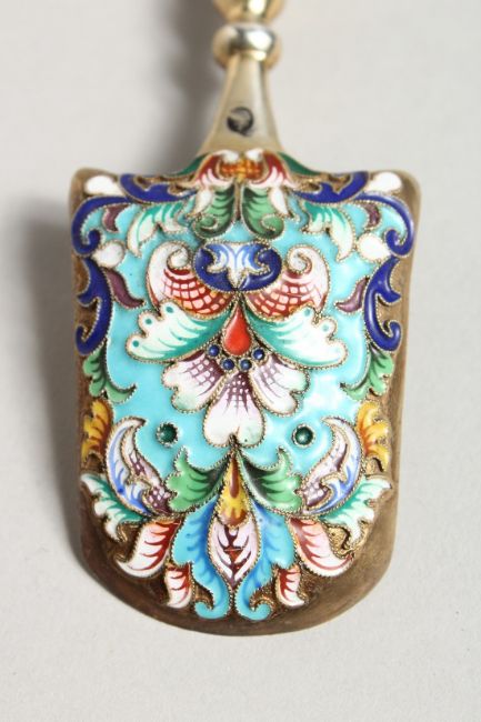 A RUSSIAN SILVER AND ENAMEL SPOON.