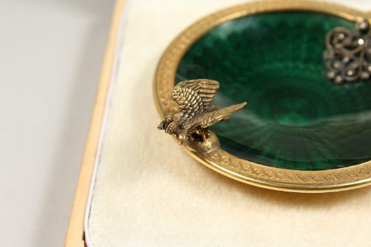 A SUPERB RUSSIAN SILVER GILT, ENAMEL AND DIAMOND SET WINE TASTER , the underneath set with a coin, dated 1902. 2.5ins diameter, bears Faberge mark E K. head and 84.