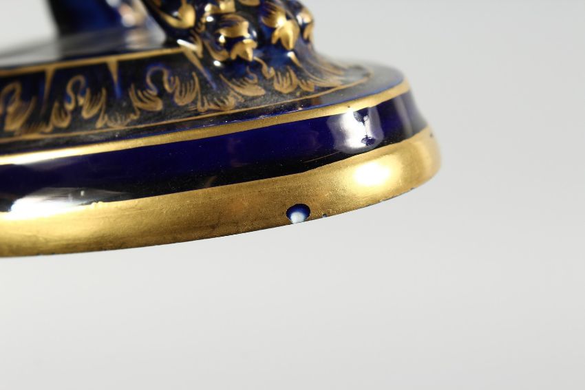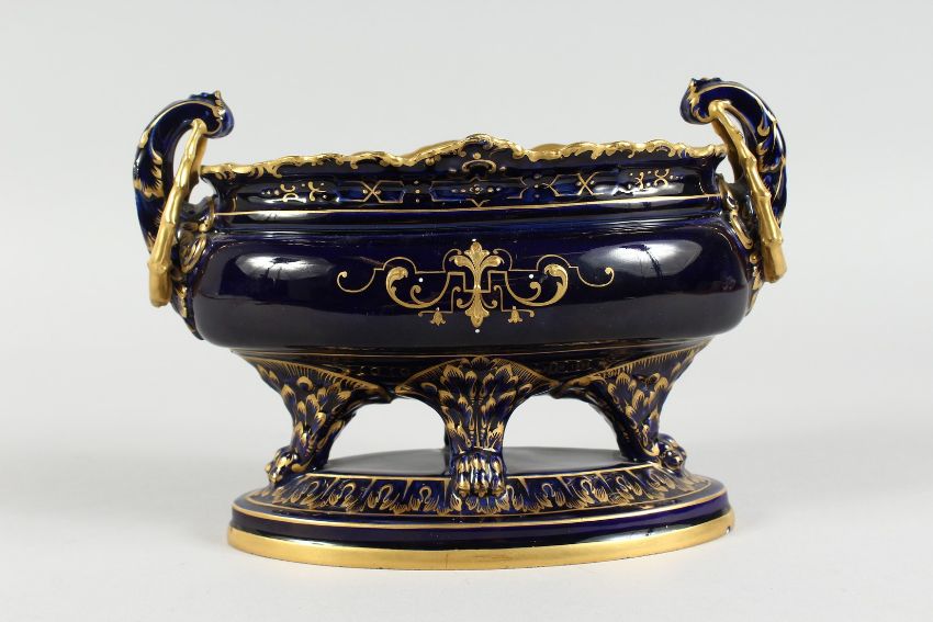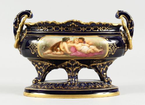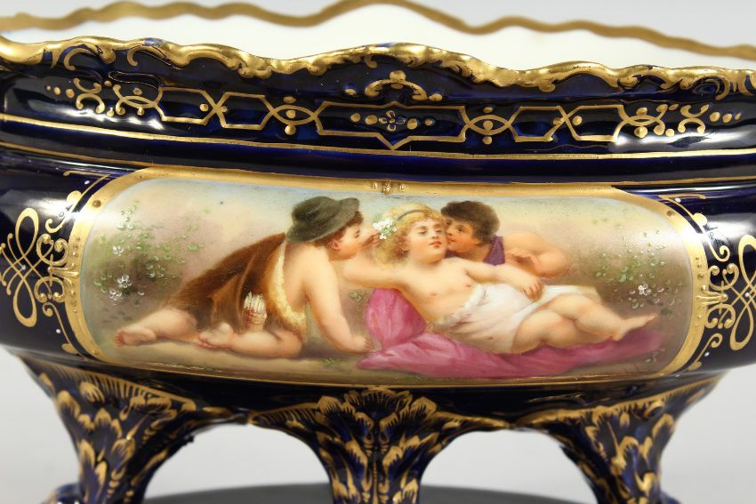 A 19TH CENTURY VIENNA PORCELAIN OVAL JARDINIERE, rich blue ground, edged in gilt and painted with ovals of cupids, mark in blue.