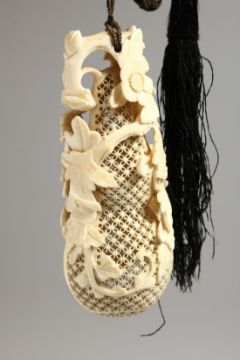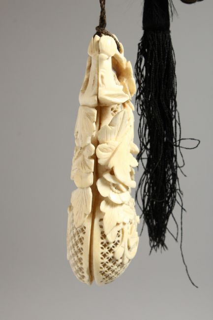 A 19TH CENTURY EUROPEAN IVORY DOUBLE GOURD with delicate painting and carved with flowers which splits in half. 4.25ns long.