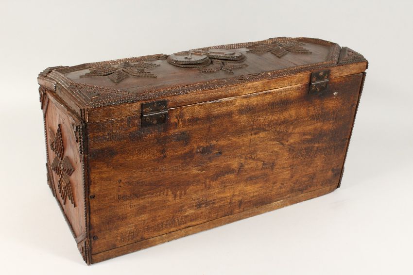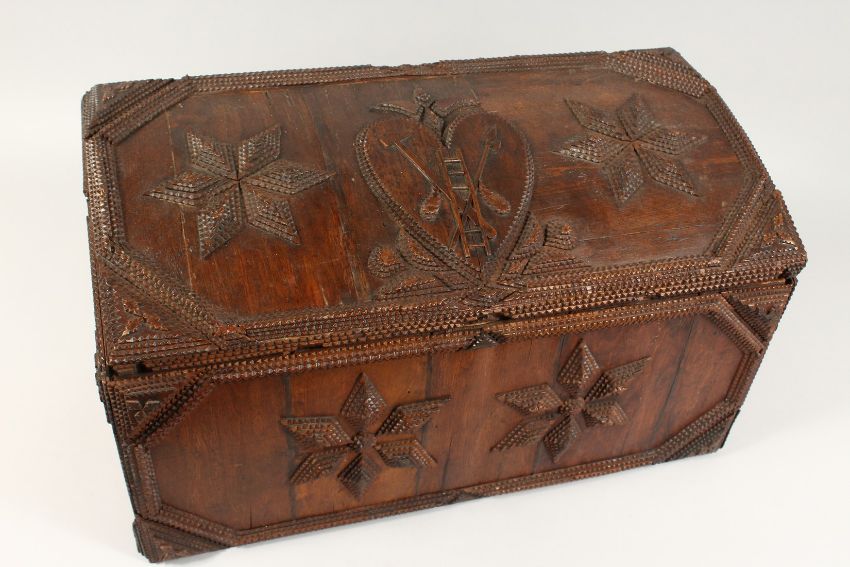 A GOOD TRAMP ART CARVED WOOD, DOMED TOP BOX, carved with a ladder, tools and star motif.
