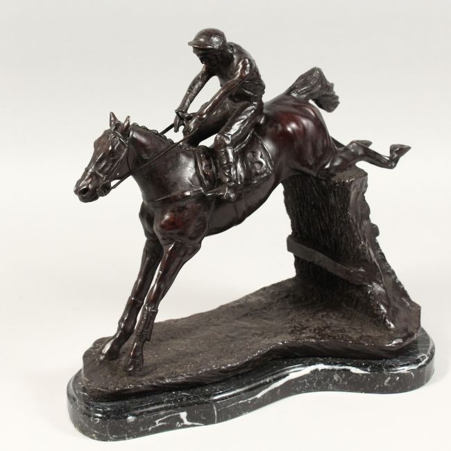 A BRONZE HORSE AND JOCKEY jumping over a fence, 12ins high on a marble base.