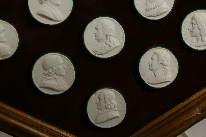 A FRAMED COLLECTION OF FOURTEEN PLASTER MEDALLIONS, Francois I, Van Dych, etc..