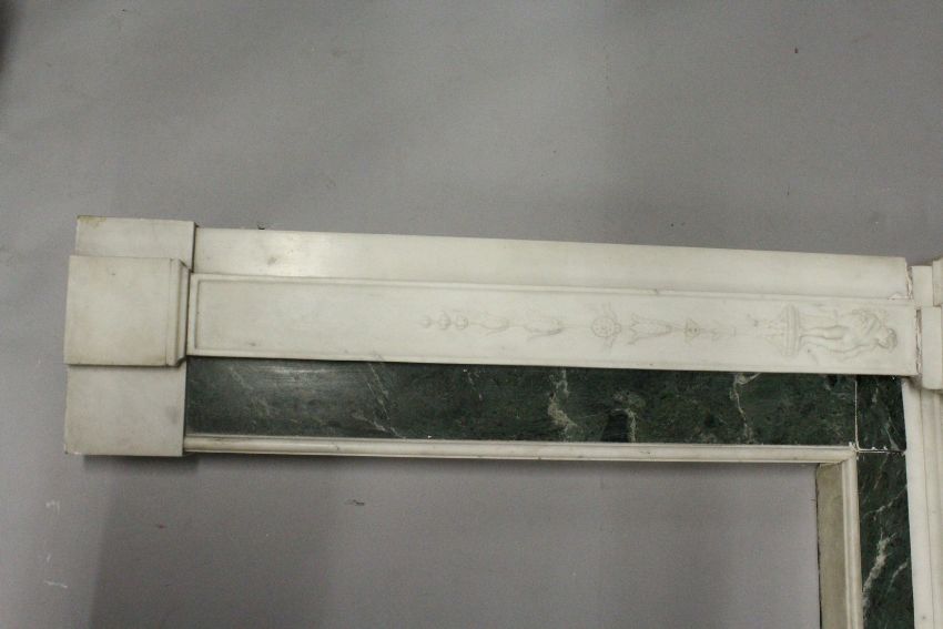 A GOOD 18TH CENTURY ADAM WHITE MARBLE FIREPLACE with panels of cherubs, chariots and columns with green marble insets. 5ft 5ins wide x 4ft 4ins high.