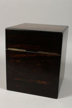 A VICTORIAN COROMANDEL CASED DECANTER BOX with three cut glass square decanters. 8ins wide.