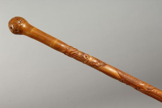 A JAPANESE ENGRAVED AND CARVED BAMBOO WALKING CANE, carved with an entwined dragon. 35ins long.