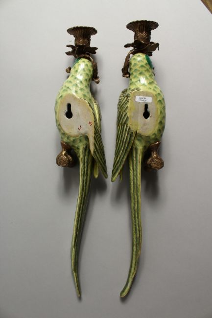 A GOOD PAIR OF PORCELAIN PARROT WALL SCONCES.