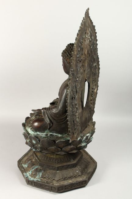 A LARGE CHINESE IRON BUDDAH on a lotus leaf stand, 36ins high.