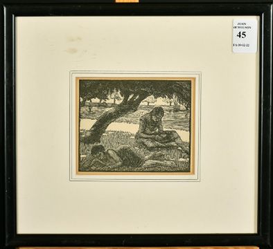 Gwen Raverat (1885-1957), The riverbank (1932), woodcut published by Mercury Press, 3.5" x 4".