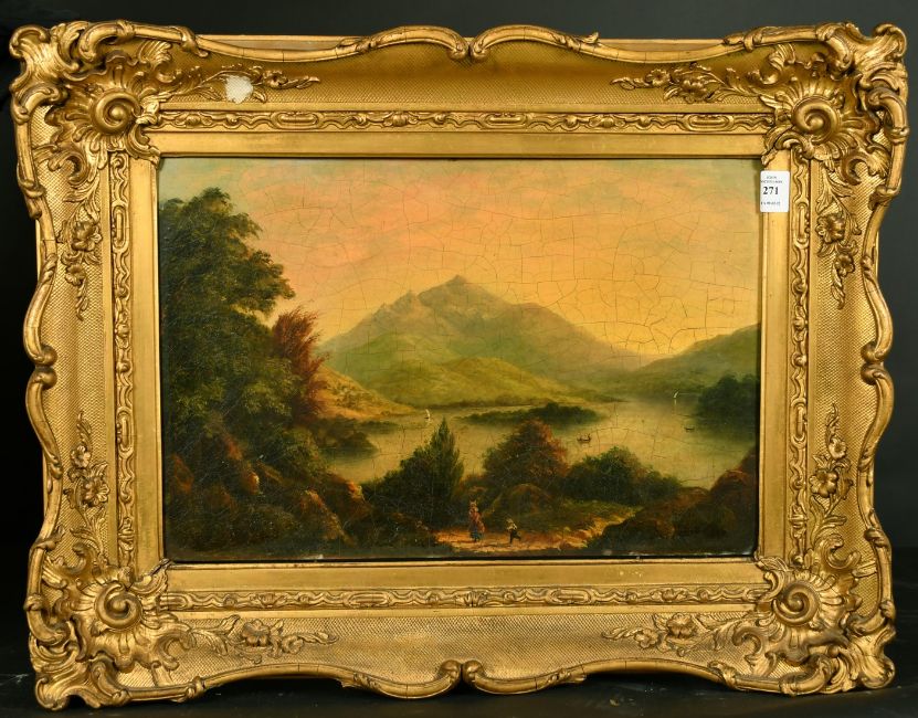 Follower of Nasmyth, 19th Century English School, figures by a mountain lake, oil on board, 12" x 18.5".