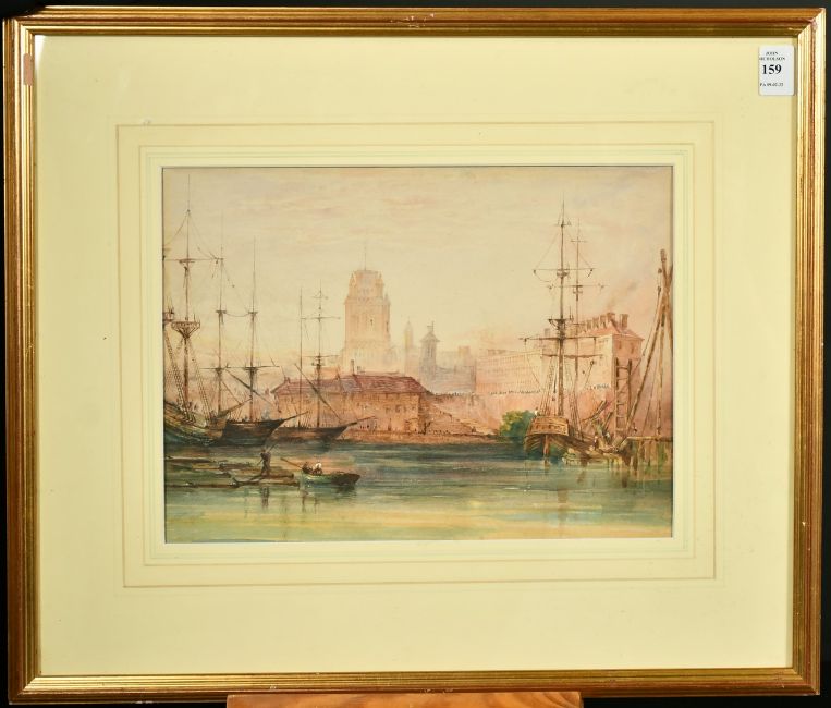 Follower of Clarkson Stanfield (1793-1867) A harbour view, possibly Havre de Grace, France, watercolour with bodycolour, 9" x 12.5", trade label verso, Swan Gallery, Dorset.