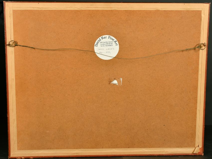 John Laporte (1761-1839) A pair of landscapes, a cottage with figures and cattle outside, and an extensive landscape with cottage with figures near a pond, watercolours, both with trade labels verso, David Ker Fine Art, London, both 14" x 20.75", (2).