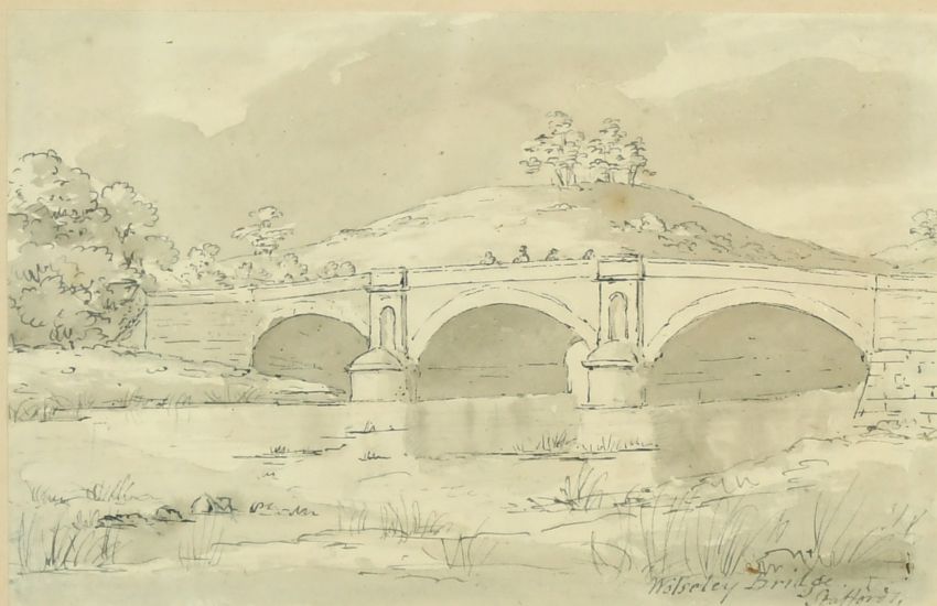 Thomas Peploe Wood (1817-1845) Wolseley Bridge, Stafford, grey wash with pen and ink, label verso with attribution to John Glover, 4.75" x 7".