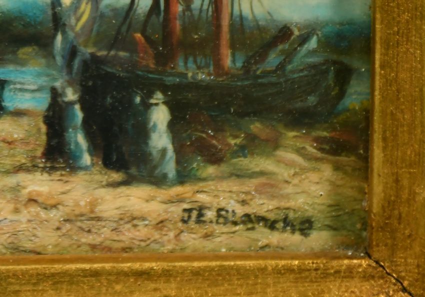 J E Blanche, 20th Century, elegant figures walking on a quayside, oil on board, signed, 4.5" x 6.25".