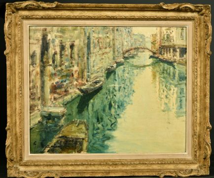 20th Century Italian School, a view of gondolas on a Venetian canal, oil on canvas, indistinctly signed, 15.75" x 19.5".