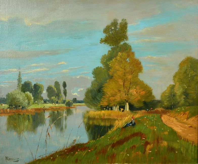 Monnier, 20th Century French School, figure resting by a riverside path, oil on canvas, signed, 18" x 22".