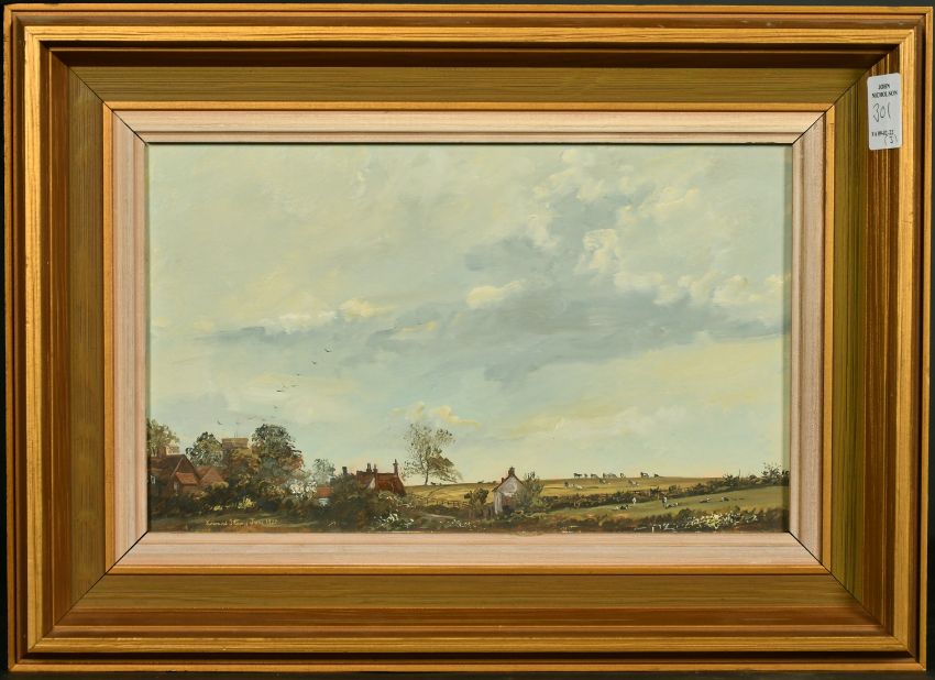 Edward Stamp R.I (b. 1939) British, June Evening, Pitchcott, Buckinghamshire, oil on board, signed and dated June 1977, inscribed verso, 10.75" x 6.5", Provenance: The Furneaux Gallery, Wimbledon, along with another by the same hand and a woodcut print of a fox. (3).
