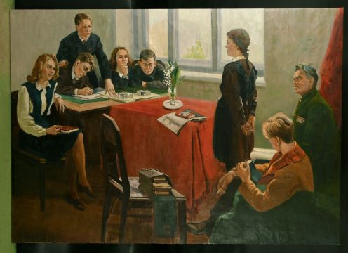 20th Century Russian School, Young figures before a committee with a military official in attendance, oil on canvas, remnants of a label verso, 54" x 79", (unframed).