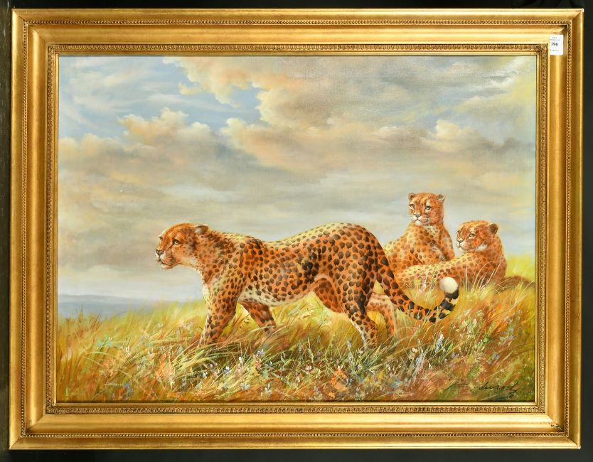 20th Century, a family of Cheetahs on a Savanna, oil on canvas, indistinctly signed, 22" x 30".