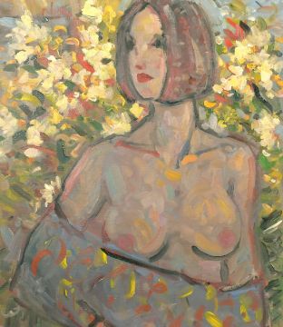 Kanwaldeep Singh Kang, signed Nicks, (1964-2000) British, A half-length study of a female nude surrounded by flowers in bloom, oil on canvas, signed, 27.5" x 23.5", unframed, from the artist's studio collection.