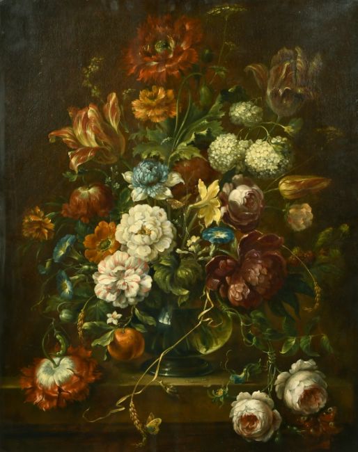 19th Century Dutch School, A still life of mixed flowers and butterflies, oil on canvas, 29" x 23.5".