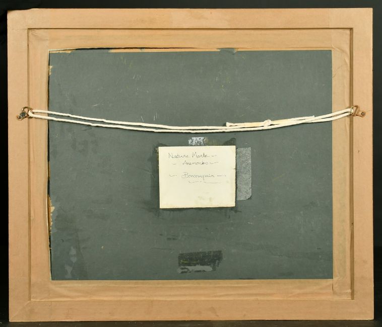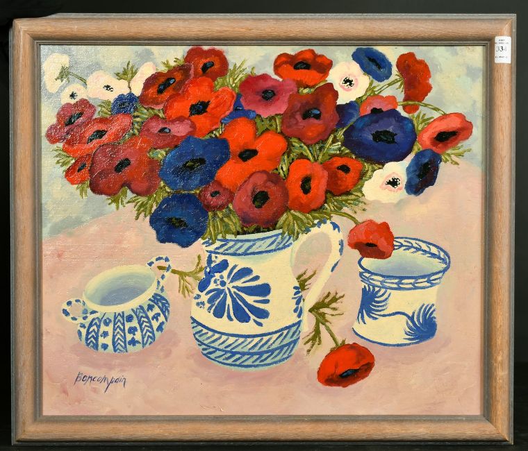 After Pierre Boncompain, A still life of Anemones in a blue and white jug, oil on canvas, bears signature, 17.75" x 21.25".