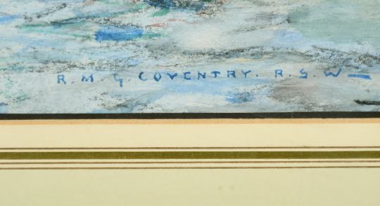 Robert McGowan Coventry (1855-1914) Scottish, Figures on a shore waiting for fishing boats to return, watercolour, signed, 10.5" x 14".