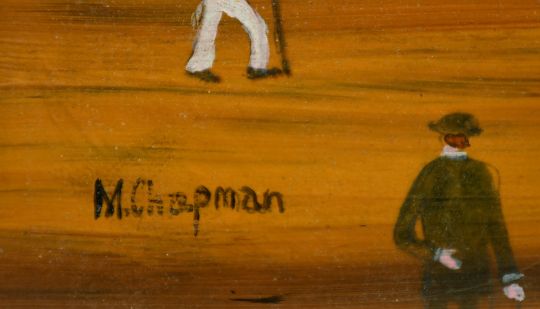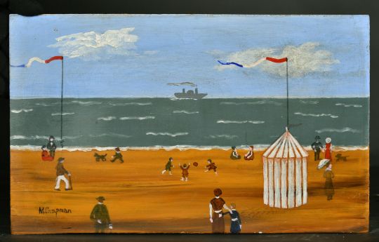Margaret Chapman (1940-2000) British, Figures on a French beach and three children playing football and a paddle steamer out to sea, oil on board, signed, 9"x 14.75", (unframed).