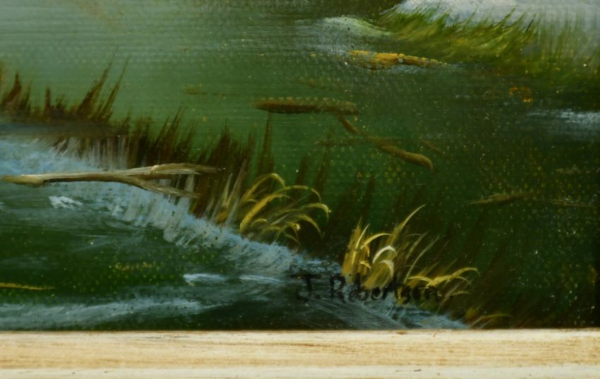J. Robertson (20th Century), figures on a frozen waterway, oil on board, signed, 10" x 20".