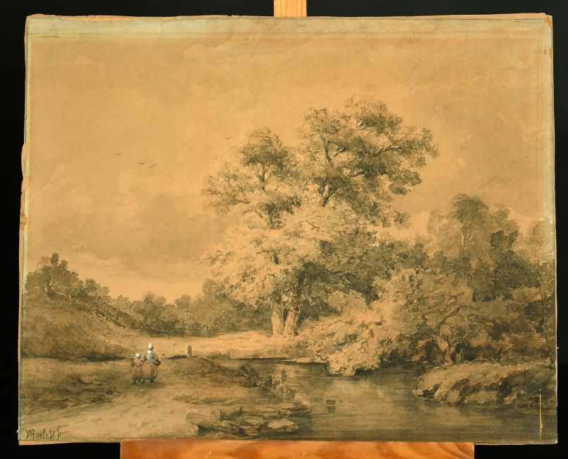 Circle of Willem Roelofs, figures walking by a pond, watercolour, bears signature, 11" x 13.5", unframed, and another of a building in a landscape, 6.75" x 9.75", (unframed) (2).