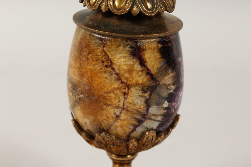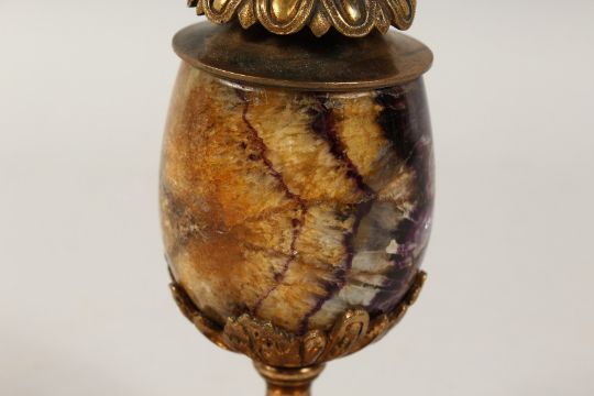 A GOOD 19TH CENTURY BLUE JOHN AND GILT METAL CANDLESTICK on a shaped base.