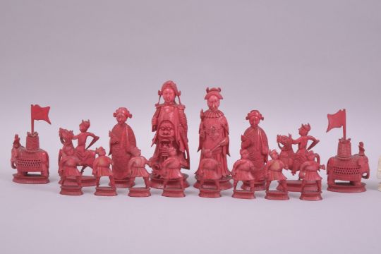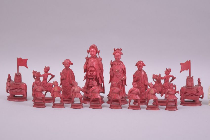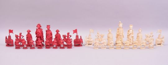 A VERY GOOD 19TH CENTURY CARVED AND STAINED IVORY PART CHESS SET, the kings and queens not matching, king 11cm, queen 10cm.
