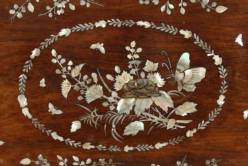 A CHINESE OVAL ROSEWOOD TRAY inlaid with mother of pearl.