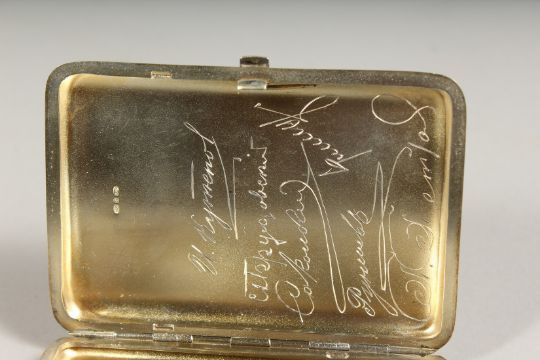 A HEAVY .925 SILVER AND BLUE ENAMEL CIGARETTE CASE, the inside engraved with various Russian signatures.
