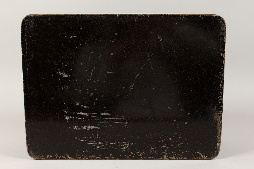 A CHINESE BLACK LACQUER AND MOTHER OF PEARL BOX inset with birds and almond blossom.