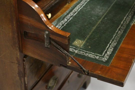 A GEORGE III MAHOGANY SECRETAIRE BOOKCASE, the upper section with a detail moulded cornice, pair of glazed doors enclosing three adjustable shelves, the base with secretaire drawer over three graduated long drawers on bracket feet.