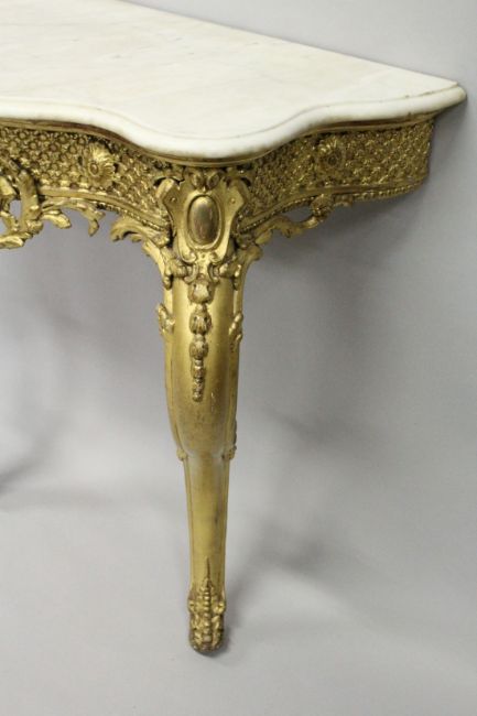 A 19TH CENTURY GILTWOOD CONSOLE TABLE, with grey veined serpentine white marble top, carved frieze on a pair of cabriole legs.