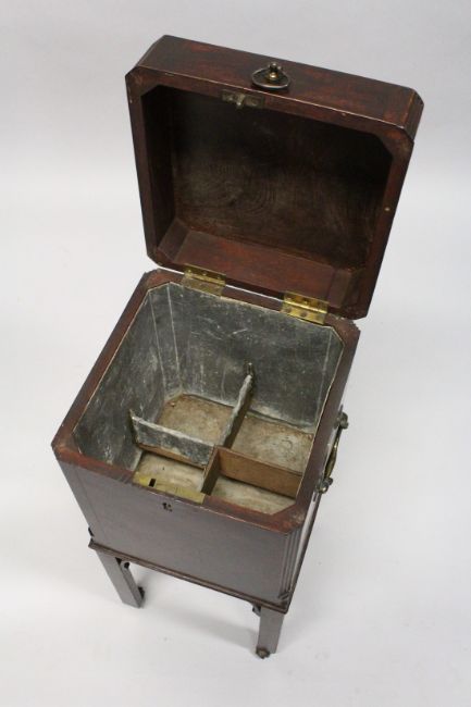 A GEORGE III MAHOGANY CELLARETTE, the hinged top opening to reveal four lead lined compartments, the sides with brass carrying handles, supported on bracketed square legs with brass and leather castors.