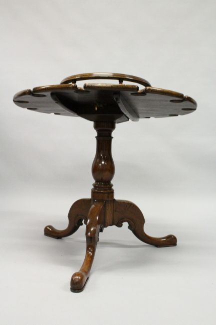 A GEORGE III STYLE MAHOGANY SHIP'S TRIPOD TABLE with centre section for bottles. The sides with sections for ten glasses on a turned plinth and tripod legs.