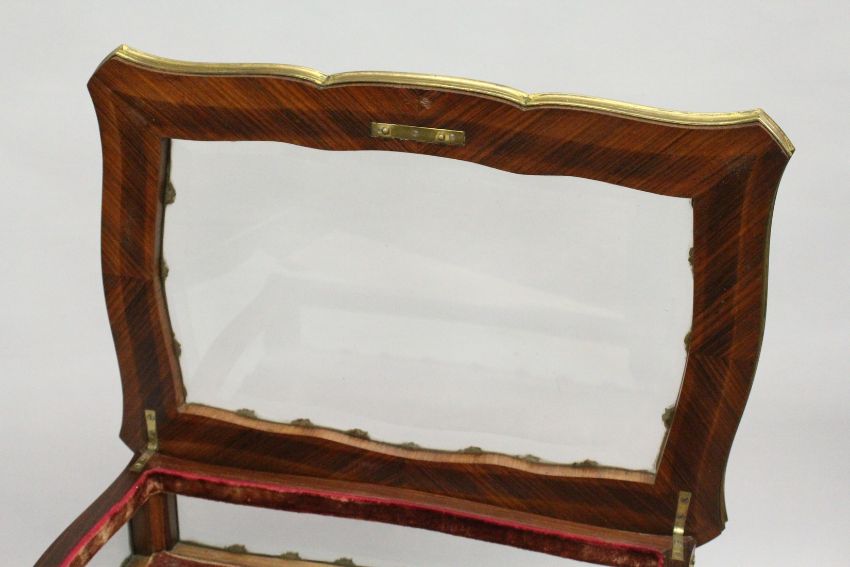 A GOOD 19TH CENTURY FRENCH ROSEWOOD BIJOUTERIE TABLE with ornate mounts, lift-up glazed top, glass sides, velvet interior on curving legs.