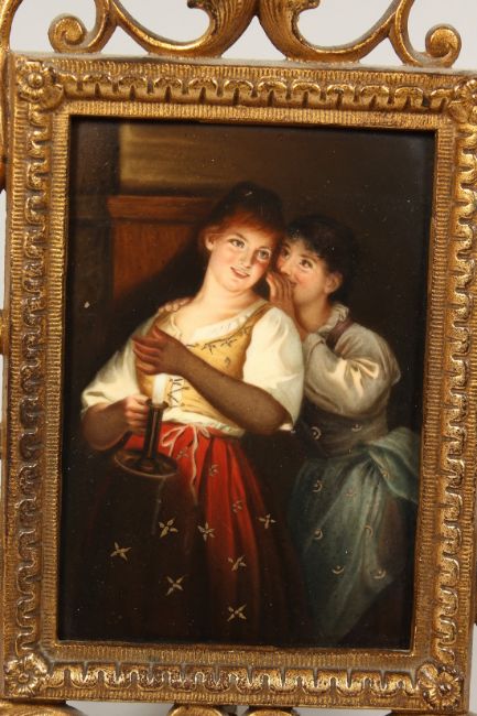 A VERY GOOD 19TH CENTRUY CONTINENTAL PORCELAIN PLAQUE, two young girls with a candle.