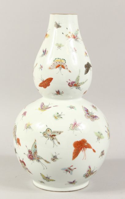 A CHINESE DOUBLE GOURD PORCELAIN VASE, the body painted with butterflies with four character mark to the base.