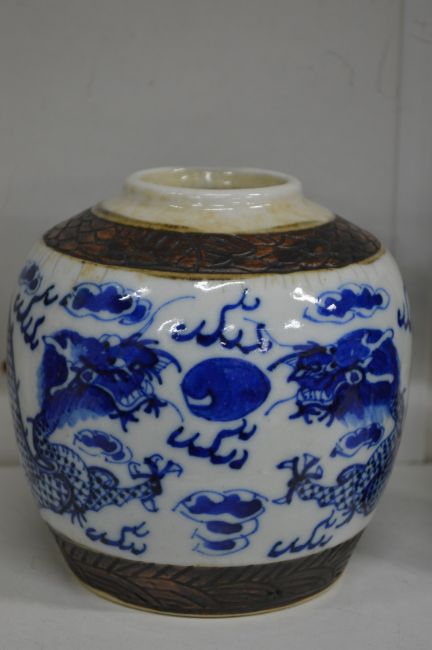 A Chinese blue and white dragon jar.