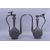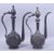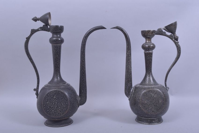 TWO FINE INDO PERSIAN ENAMELLED BRASS EWERS, each with scrolling foliate decoration, 39cm and 38cm high (2).