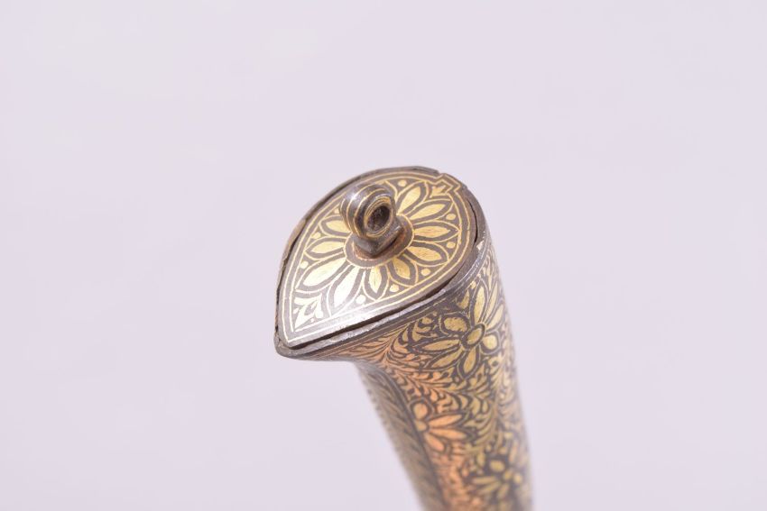 A 19TH CENTURY INDIAN KOFTGARI DAGGER WITH GOLD DAMASCENED HILT, the steel blade 32cm long, the handle inlaid with gold floral motifs, overall length 46cm.