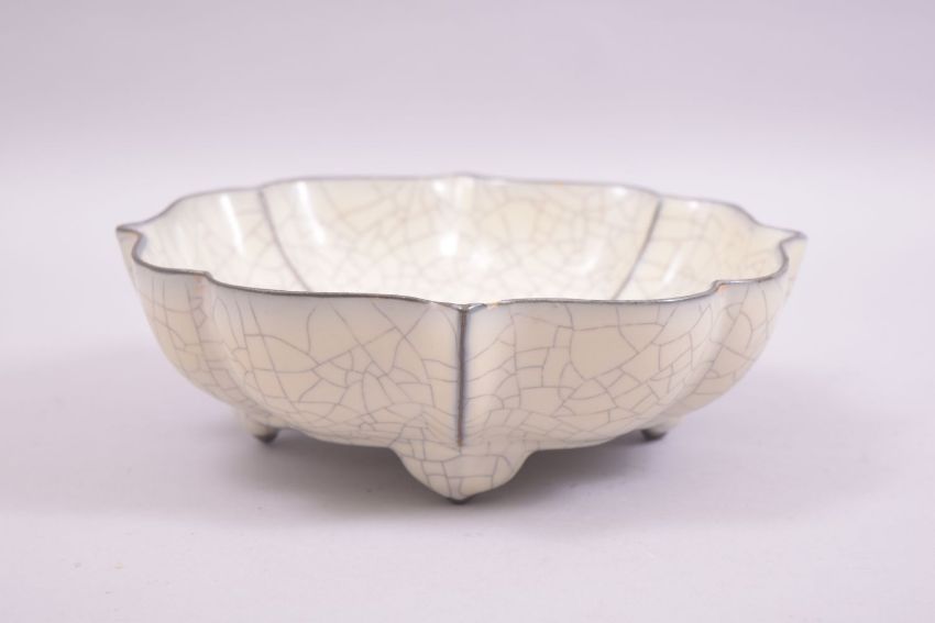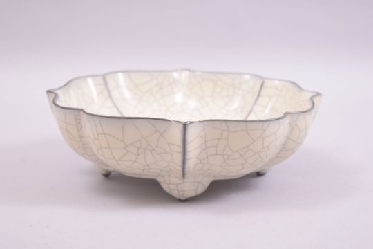 A CHINESE CRACKLE GLAZE FOLIATE SHAPED BOWL, supported on four feet with incised calligraphy to base, 20.5cm diameter.